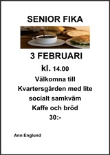 Publicerat 2026-01-18 av adminSeniorfika tisdagen 3 februari Välkomna till Kvartersgården med lite socialt samkväm, kl 14.00. Klicka på bilden för en läsbar pdf-fil.